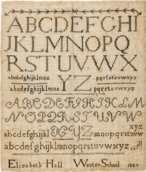 By the nineteenth century, a predominant form of embroidery was the “sampler,” which recorded the stitches learned by the embroiderer, typically a young girl. Most of these included alphabets, verse, and/or testimonies of faith, in letters cross-stitched on the grid formed by the fabric’s weave, demonstrating the talents, literacy, and piety of their makers. Among them we find consistent lettering styles, striking precursors of today’s pixel fonts. Norms for these letters were reinforced by teachers and by earlier samplers themselves.